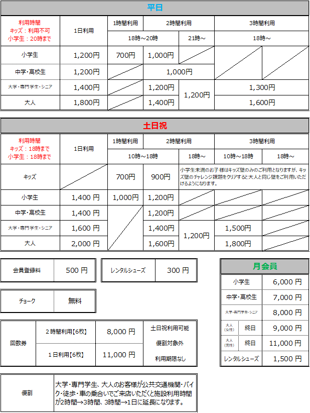 ◆幼児・小学生のお子様はキッズ壁の利用をお願いします。(条件有り)